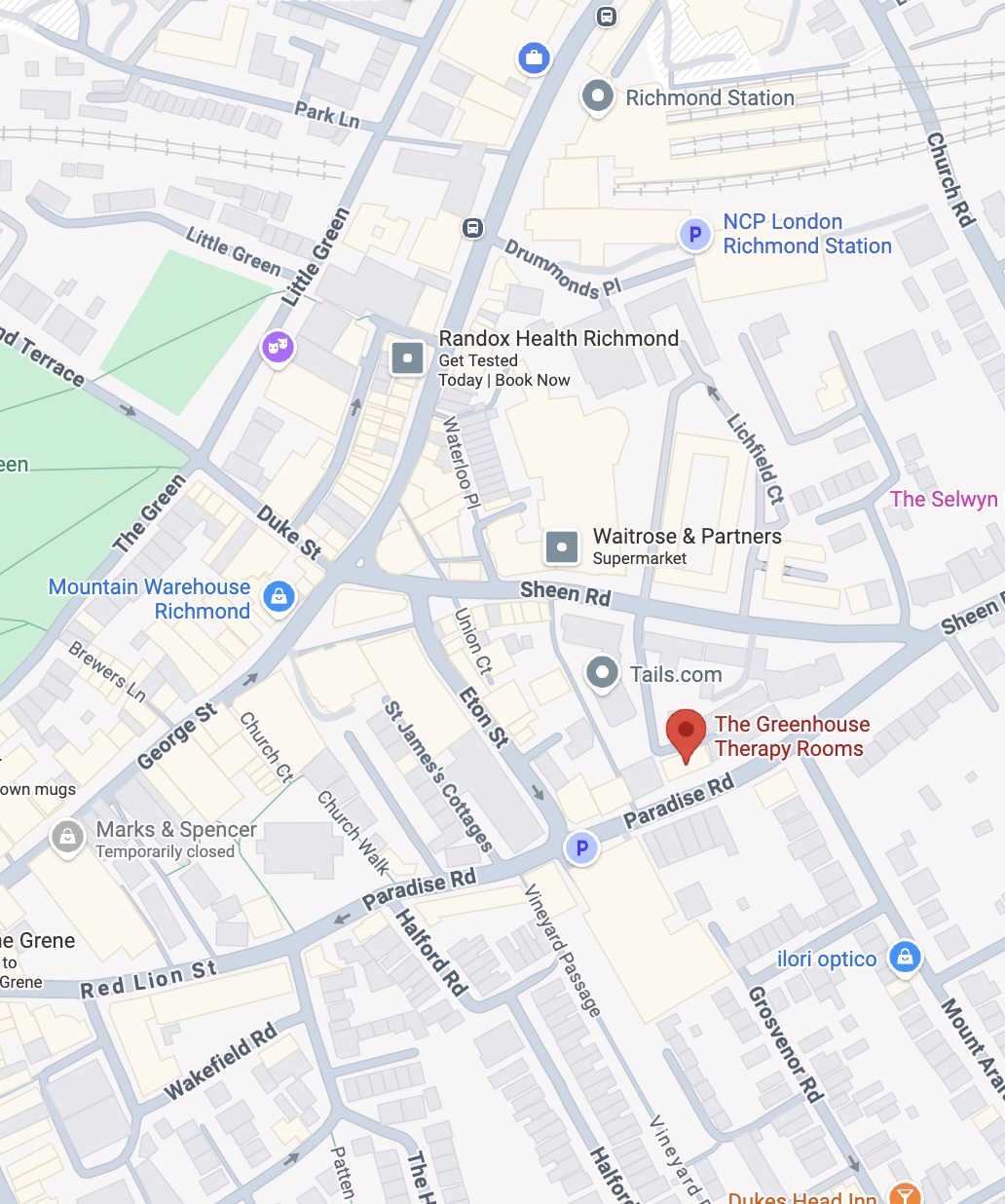I am available for appointments during office hours from my consulting room at The Greenhouse Therapy Rooms, 26 Paradise Road, Richmond Upon Thames, TW9 1SE. Centrally located in Richmond Town Centre , the therapy room offers a light, calm and peaceful location with easy access to all local transport links: just a 5 min walk from Richmond station, 4 mins from Wakefield Road bus station and 1 min from Paradise Road Multi-Storey Car Park. I also offer online therapy via Zoom.